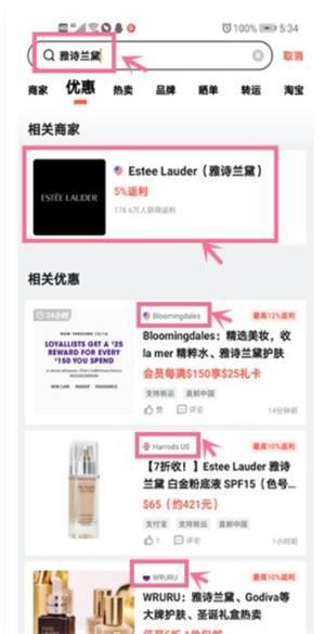 1、很多用户想买某个产品,但是又不知道哪个网站在打折,那么就可以直接在55海淘搜索栏搜索,如雅诗兰黛;