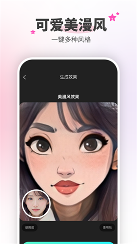 青果派app实现漫画脸部的一键AI转变,无论直接拍摄或二次编辑均可轻松完成,颇有个性特色,多样的漫画风格任由用户挑选,随心拍出唯美独特的动漫自拍照。