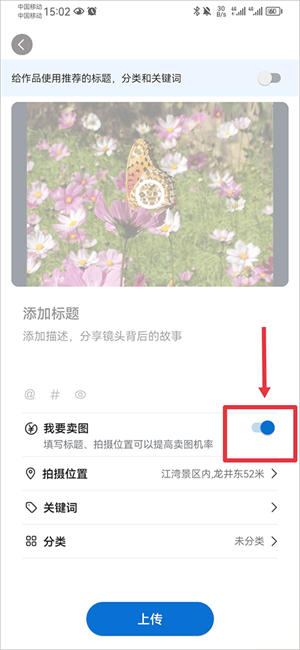 4、最后在作品上传界面中将作品标题、描述、分类等完善后,将我要卖图功能开启。提交后就可以等待卖家购买啦