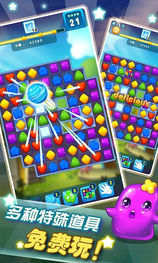 消灭星星2糖果粉碎是消灭星星的续作,消灭星星2糖果粉碎全面超越《消灭星星1代》《天天爱消除》,三消类型的手游。几百个关卡,超长手游时间,可爱甜蜜的手游风格,广大女性游戏者的最爱哦! 手游中您可以体验到其它手游所不一样的乐趣。由于各种特殊糖果的存在,各种手游模式的共存,使手游变的不再是简单的消除,它需要思考、需要坚持、也需要信心。《消灭星星2粉碎糖果》越往后越刺激、越有难度!喜欢消除类型的手游的朋友快来试试吧!