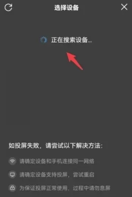 此时,应用会搜索可用的投屏设备。选择您的电视设备进行连接。