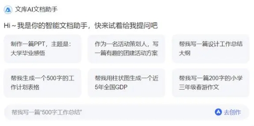 百度AI助手PPT一键生成,集成在百度旗下的「百度文库」中,使用搜索引擎的过程中,有时能看到类似下图的入口,点击右侧的「去创作」,就会打开百度文库界面。