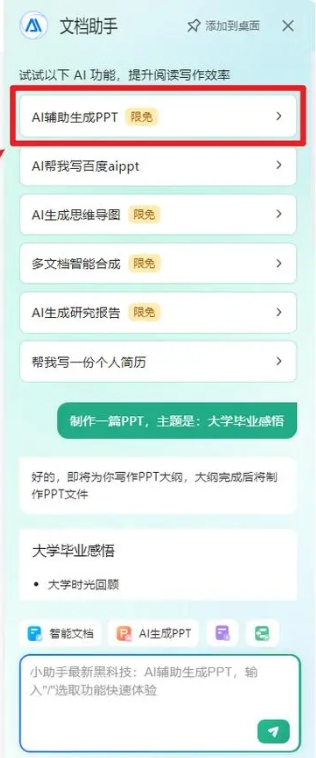 文库右侧的「文档助手」面板,就能看到百度aippt一键生成的入口,点击「AI辅助生成PPT」,输入PPT主题,百度aippt会先生成PPT大纲,之后在大纲的基础上一键生成PPT。