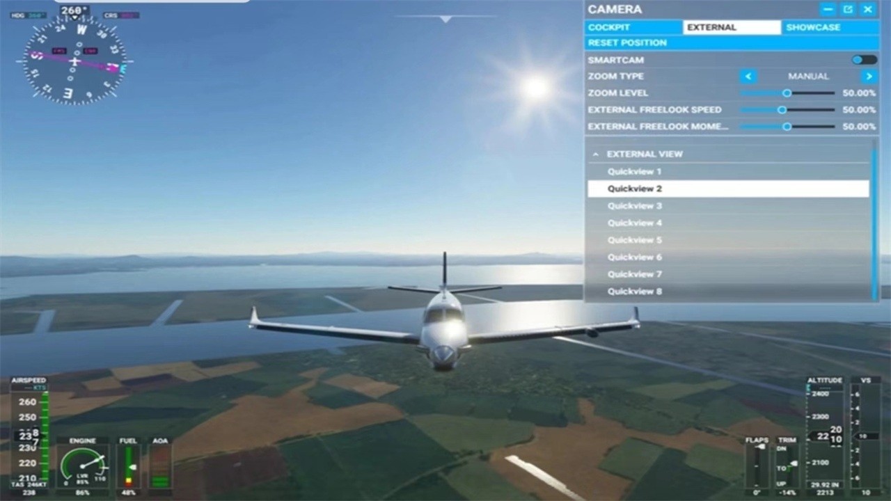 改变你的驾驶舱视图或外部视图。控制所有的襟翼,修剪,扰流板,装备和打开或关闭发动机。