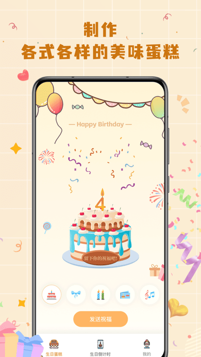 电子生日蛋糕作为一款一个非常有趣又好玩的手机趣味模拟生日蛋糕制作发祝福软件。在这里,用户可以直接通过本软件进行手机蛋糕diy个性化创作,玩家可以随意添加各种装扮和外观,设置贴纸的生日祝福语,一键转发分享给朋友们。感兴趣的朋友们快来haolingcc下载试试吧!