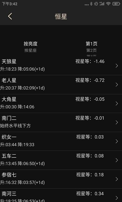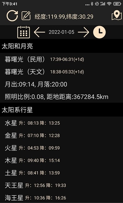 3.每日:每日暮曙光,月出月落,行星出落,可见星座,恒星,messier