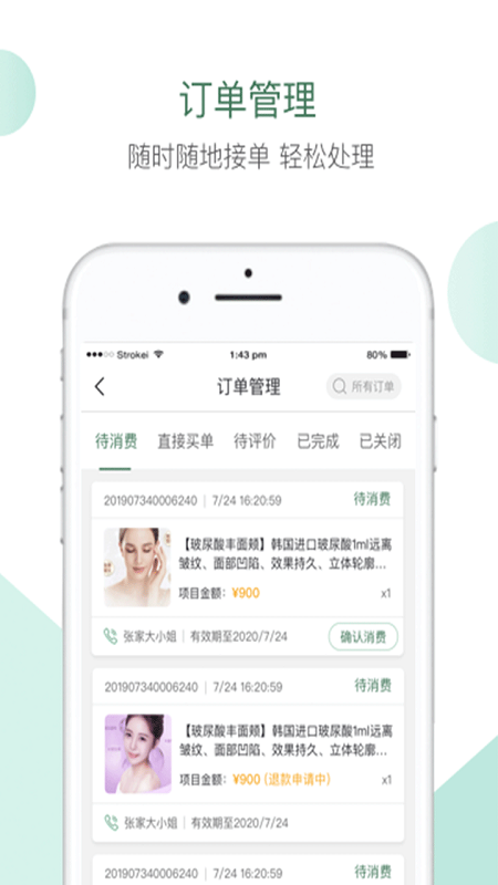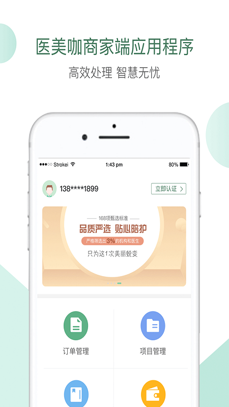 1、医美咖商家端提供项目管理、订单管理、收益查询等一系列功能,帮助机构高效管理业务,提升效益。