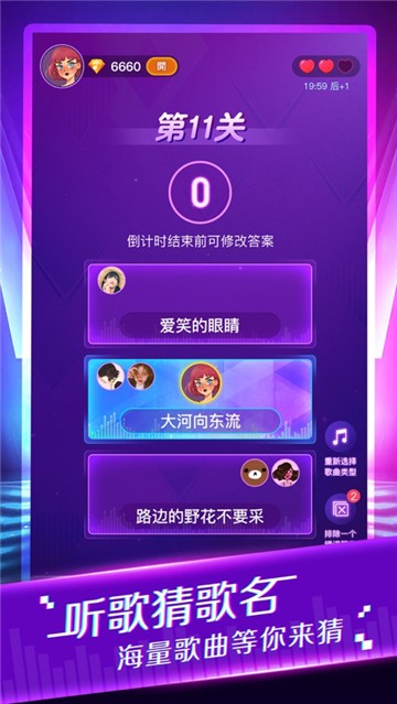 3、通过聆听歌曲的旋律猜歌名,正确输入歌曲名称才能进入下一个关卡。