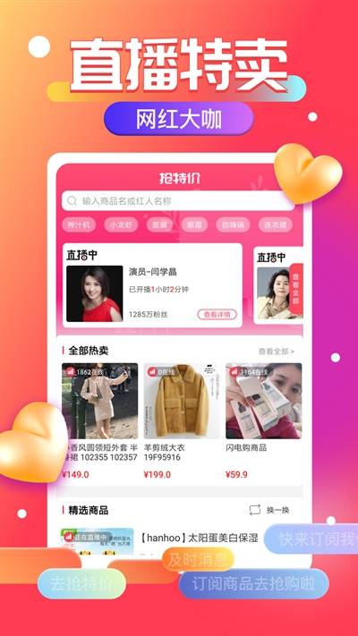 抢特价商品是一款价格便宜、质量优良的购物软件,提供海量精品商品种类,用户可放心购买,并享受超低折扣,商城还不定期发放特价商品。该软件提供直播交易功能,包含数十万款快手直播的优质低价产品,用户需考验手速来抢购商品。亮点有快手人气主播、数十个品类、每天有惊喜等着用户。该软件还提供优惠券搜索工具、神奇购物车和专业买家推荐的优质好货等特点,帮助用户省钱购物。
