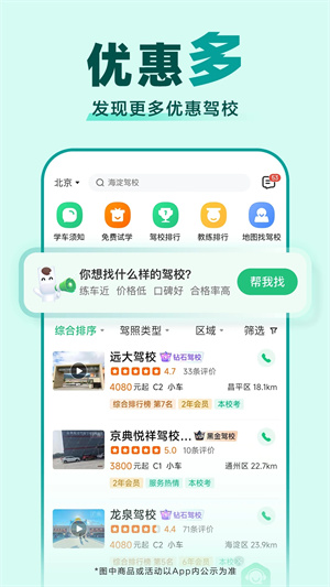 科目二科目三3D学车,模拟真实场景革新交互,给用户沉浸式体验,用手机随时随地练车;科目三考场视频,考场线路实拍,实现提前看考试场地,帮助用户降低考前焦虑情绪。