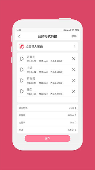 1、音频格式转换:支持MP3、AAC、AMR等主流格式音频之间的格式转换