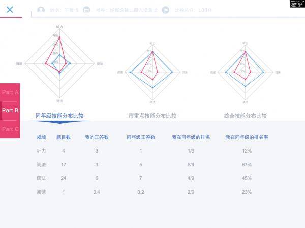 2、基于云端大数据,生成详细的个性化测评报告,多维度展示孩子的英语水平。