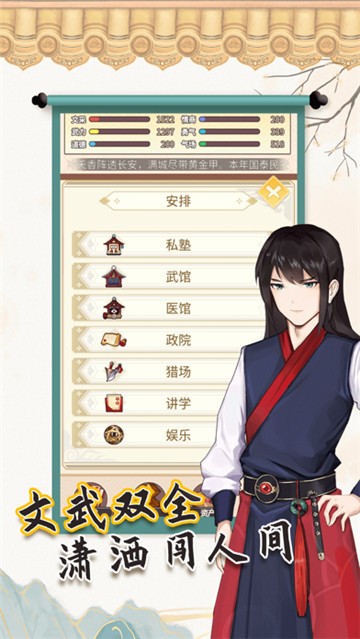 3、玩家可以选择不断提升自己自己的属性值,达到琴棋书画样样精通,各种系统互相融合,在古代中成长。