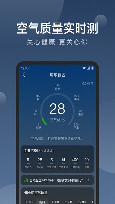 4、实时监测:空气质量,PM2.5等6项空气质量指数实时看,24小时天气情况逐时看