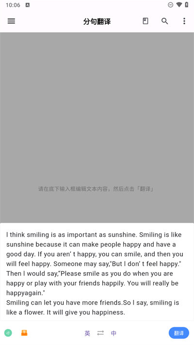 【分句翻译app下载】分句翻译app,这是一款功能非常强大的翻译软件,分句翻译app为用户提供各种汉译英功能,用户可以使用这些功能翻译文章,翻译速度非常高,能够准确翻译各种文章,分句翻译app的界面十分简洁,使用起来非常方便,对分句翻译app感兴趣的用户一定不要错过哦!