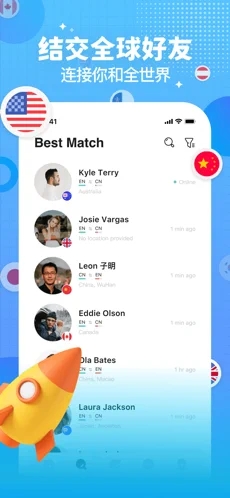 1、不同的国家都可以注册这个软件,在软件中可以即时匹配到世界各地超多的用户。