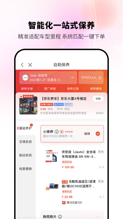 京东京车会基于京东大数据技术和人工选品,根据车型及行驶里程,精准适配商品及服务项目,保障品质及适配度,真正实现一站式智能保养