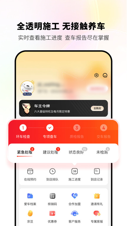 京东京车会提供线上线下一体化的标准服务模式,到店履约全程透明。车主可使用APP预约、排队、确认工单及报价,查看车辆环检、专项查车等详细报告,让广大车主安心省时,售后无忧
