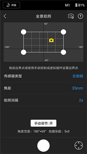 4、自定全景拍照参数,需要全景拍照的话能够自选体感器类型、焦距和拍照间隔以及角度范围