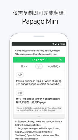 Papago翻译器是一款好用的在线翻译软件,一款专业解决用户的翻译问题,在app里仅需复制就能轻松实现便捷的翻译方式,轻轻松松,点点就能实现文本质量的翻译。这次本站提供的是Papago官网资源,用户可以在这里一站式使用全新的智能化翻译器,精准实现用户的翻译需求,多种语言都能在这里互相翻译,让用户可以在这里快速学习他国语言。