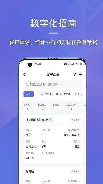 2、实现了数字招商的全面升级,提供独特的客户管理服务,以数字化方式高效管理客户,并能助力数据分析,让用户了解更多科技信息,享受舒适便捷的科技管理服务。