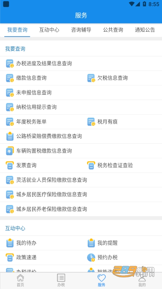 “服务”模块用于税费信息查询及税费政策咨询辅导,包括税费信息查询、互动中心、智能咨询等功能;