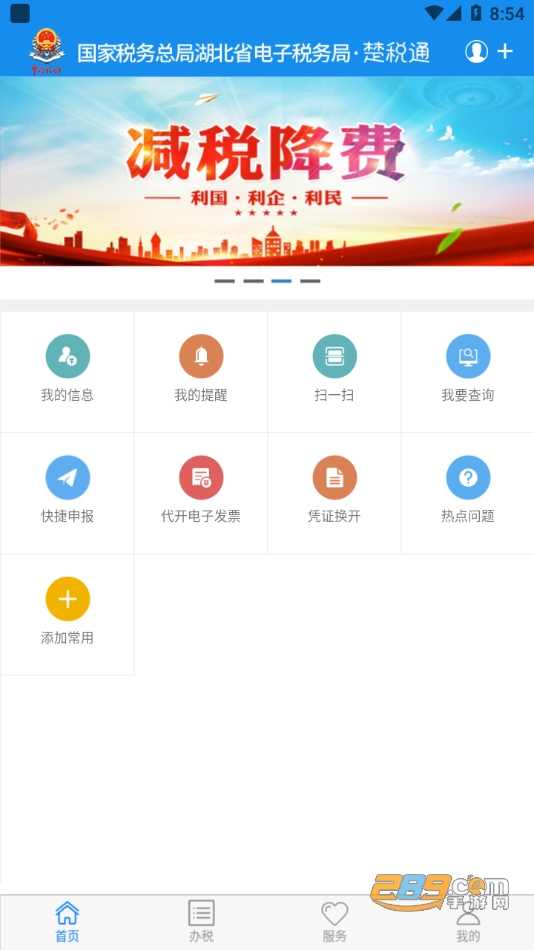 “楚税通”分为“首页”“办税”“服务”“我的”四大模块。其中