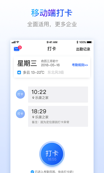 4)实现了在线打卡功能,能准确记录用户每天的上班出勤情况,让考勤管理更规范。