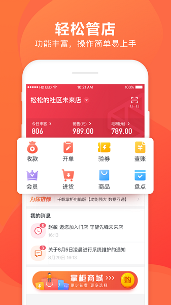 千帆掌柜收银系统是一款集收款、销售、经营等功能于一体的App。适配多种硬件,系统流畅。具备商品管理、库存盘点、店员管理等,多种支付方式与会员营销手段,还有强大的库存管理能力。无论店铺大小,都能轻松管店,提升效率与收益,是商家的得力助手。
