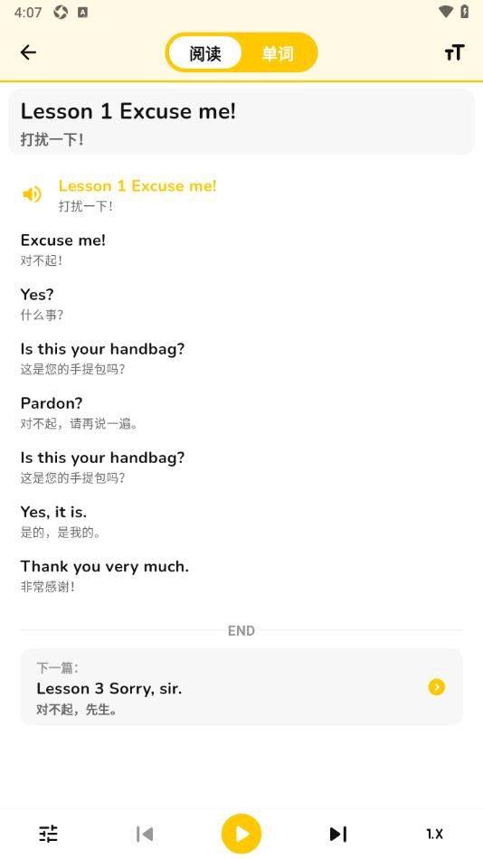 新概念英语随声听app,一款助力英语学习的便捷软件。内容及时更新,丰富全面且免费获取,操作简便。可随时开启学习,英美音随意切换,多语显示,语速自由调节。还有夜间护眼模式,保护视力。英美音切换、单词播放、精听模式等功能,满足各种学习需求,让你高效学习英语。
