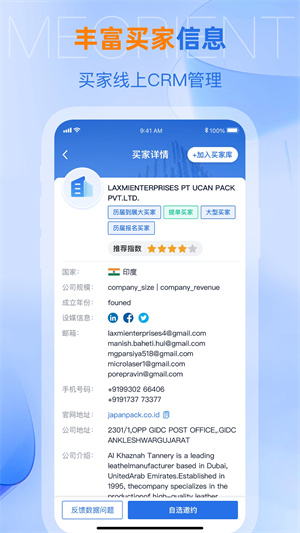 网展贸是一款专为外贸行业设计的服务平台,它结合了线上与线下的资源,旨在促进国际贸易的便利性和效率,网展贸将线下贸易信息进行整合,并在线上平台进行推送,使得买家可以随时查看和了解最新的贸易资讯和产品信息,用户可以轻松地与买家进行线上沟通,包括即时消息、语音通话等功能,便于建立商务联系。