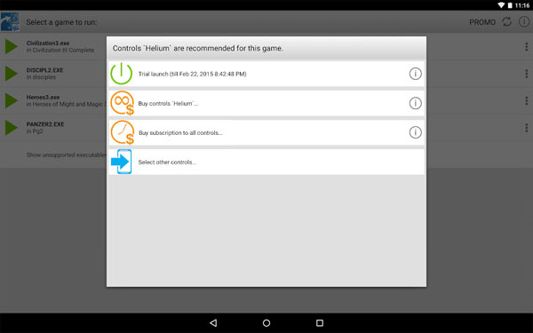 1、ExaGearStrategies模拟器提供有两种控制方案,分别为“Helium”和“Cuprum”,帮助在智能手机或平板电脑上更轻松简易的操作经典PC游戏,或许是由于策略类游戏的缘故,在较大的平板电脑显示屏或触摸界面下,兼容性都相当不错。