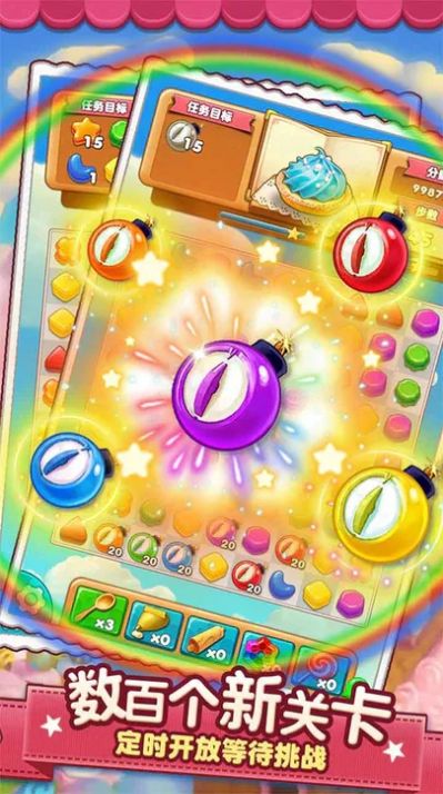 1.通过消除相同颜色的糖果来完成关卡,具有简单易上手、乐趣无穷的特点;