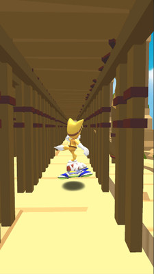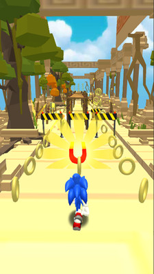 遵循经典的索尼克造型,一路狂奔,收集金戒指,躲避障碍物等。