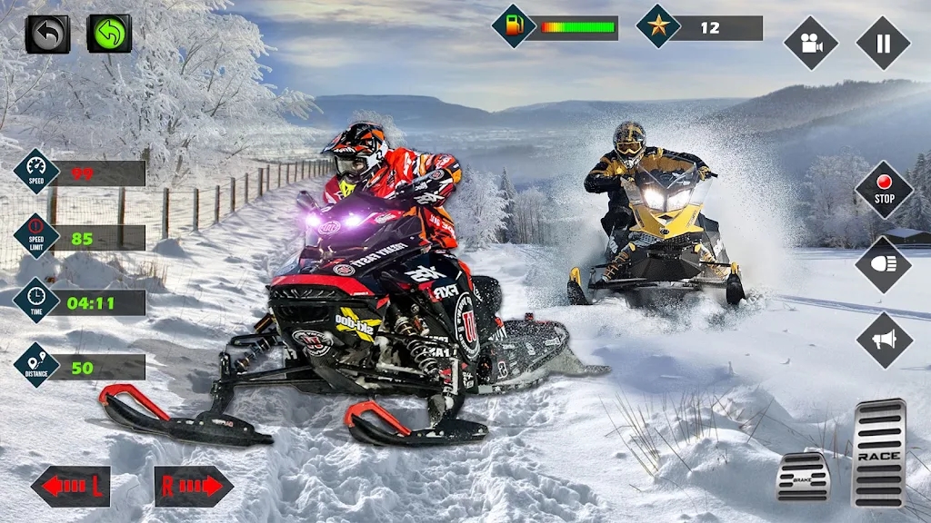 1、玩家可以操控雪地摩托穿越复杂地势,考验玩家的技巧与反应速度;