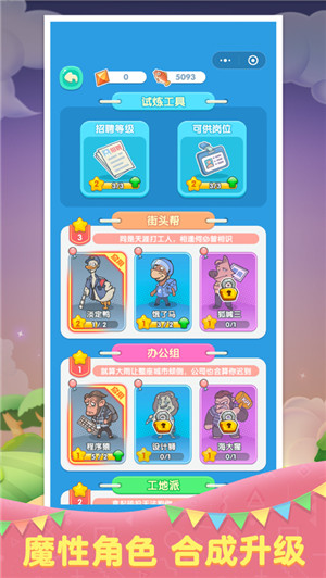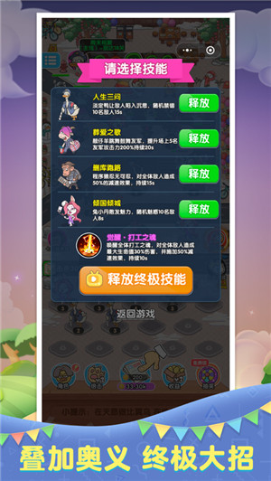 1.在游戏中合成打工人英雄,升级属性和技能,放置到指定位置展开防御。