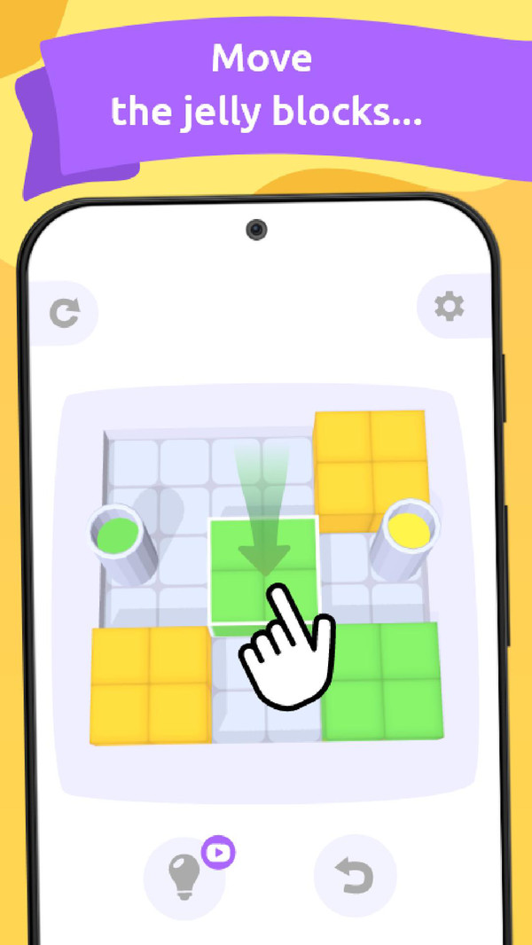 3、游戏世界中充满着障碍,思考不同的过关丰富,玩家需要找出正确的方式来拖动和合并果冻块。