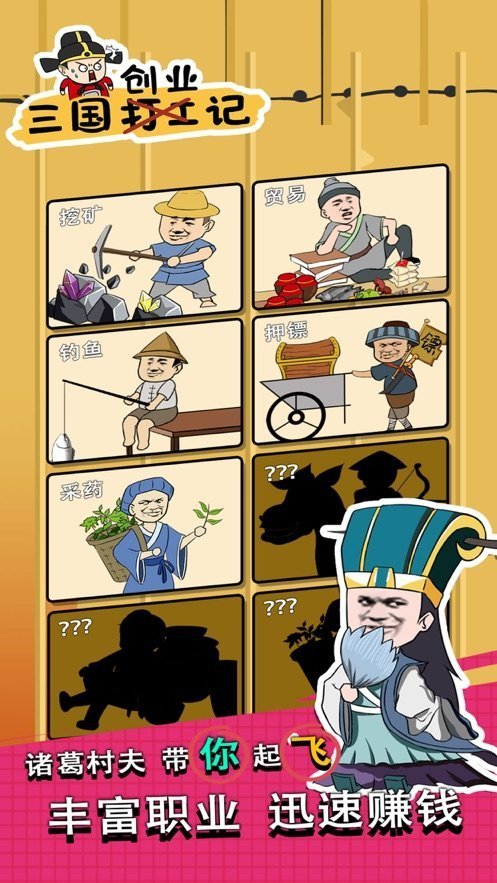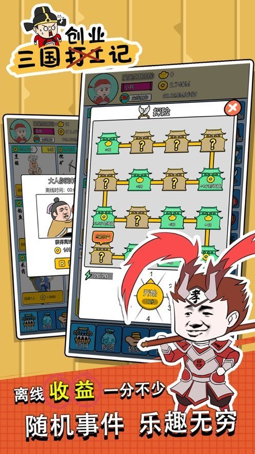 三国创业记破解版是一款玩法非常有趣的放置挂机养成手游,游戏中玩家在三国时代,你需要通过打工赚取大量的金钱,通过收集武将提升自己的战斗能力,还能进行贸易提升经济,随着游戏的进行,你可以解锁更多的玩法,玩家能够在地图中割据一方,发展自己的势力,游戏中你将用于十分强大的策略能力,可以指挥自己的军队消灭敌人,获得更大的地盘。