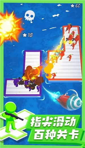 2.丰富的关卡等玩家去解锁,简单的对战,合理的运用自己的武器和你的道具,还有很多冒险的玩法,丰富的地图等着你去探索冒险。