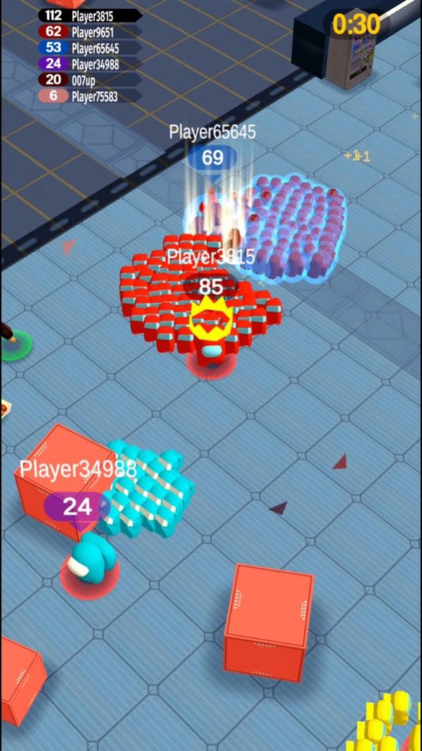 我们之间的拥挤战争游戏是一款非常有意思的动作对战类游戏,在这款游戏中玩家操控自己的太空人四处去寻找更多的人加入你的队伍,还可与寻找地图中的食物道具,吃了后你就会变得比之前大很多,这样你就可以轻松的击败你的对手了哦,游戏中瞬息间千变万化,玩家需要小心应对哦。