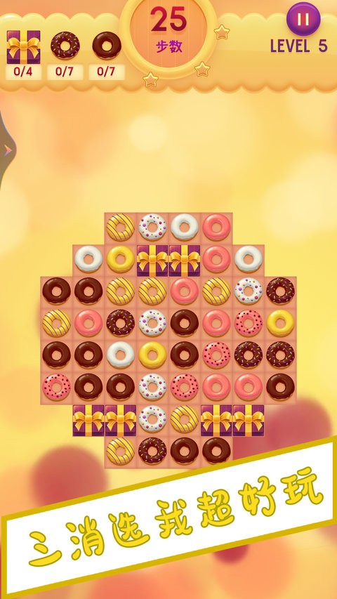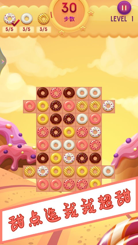 3、游戏提供了多个关卡和挑战,每个关卡都具有不同的难度和目标,如清除特定数量的甜甜圈或在有限时间内达到特定分数;