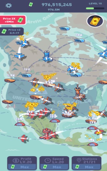 点击屏幕带领人员离开候机室,登上飞机前往他们的目的地,赚取海量的财富。