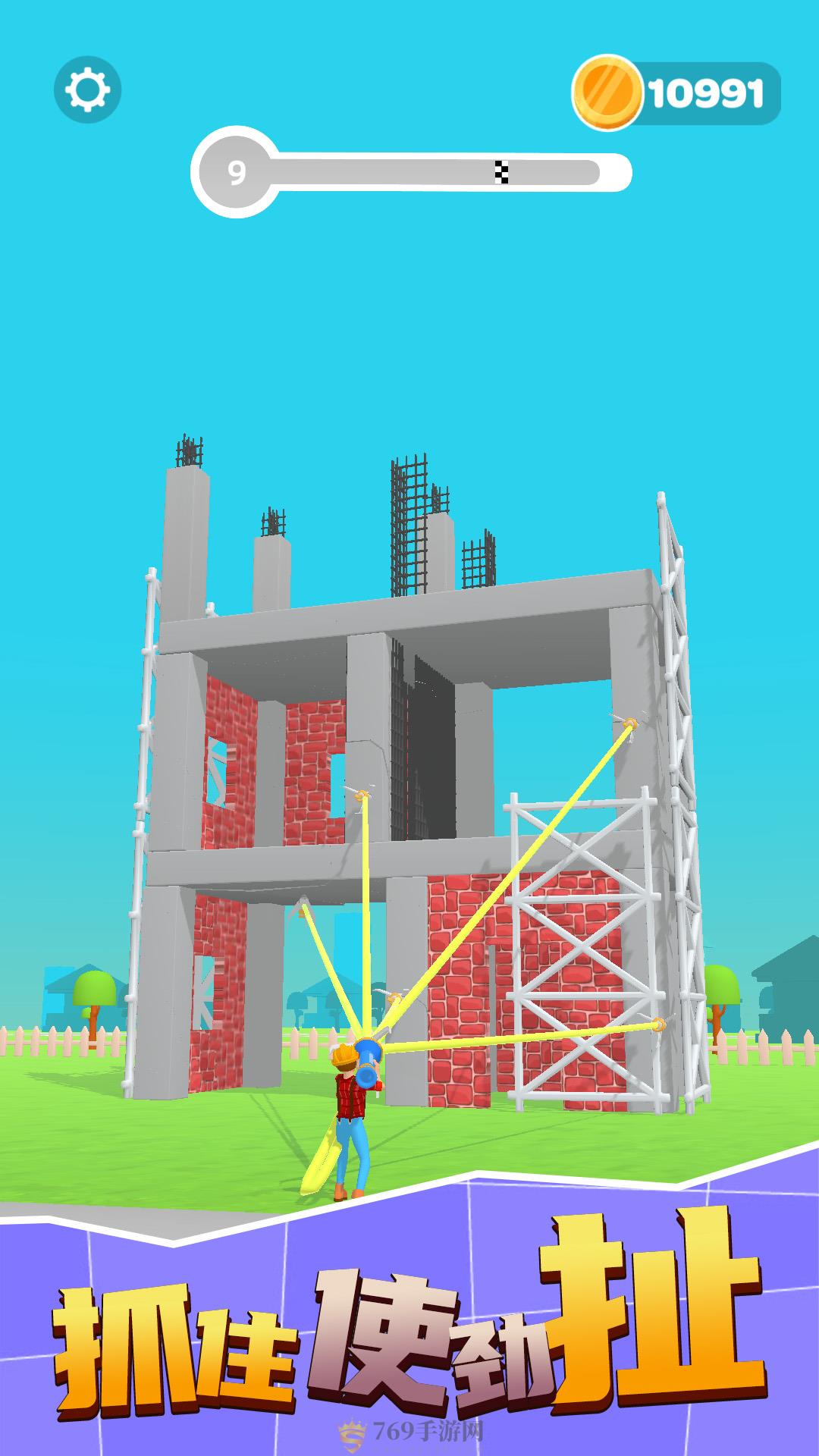 1有着非常简约的画面,点击瞄准发射一根根的绳子,固定住建筑的表面,然后不断用力的往后拉,将一栋栋的建筑全部的推到顺利通关。