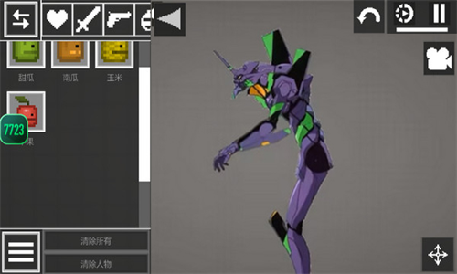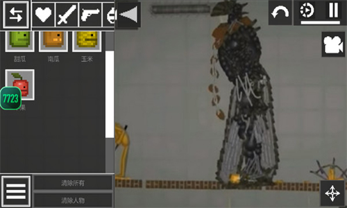点击打开物品栏,在手游里游戏者可以添加甜瓜人、玉米人、桌子,以及装备手枪、放置炸药等。