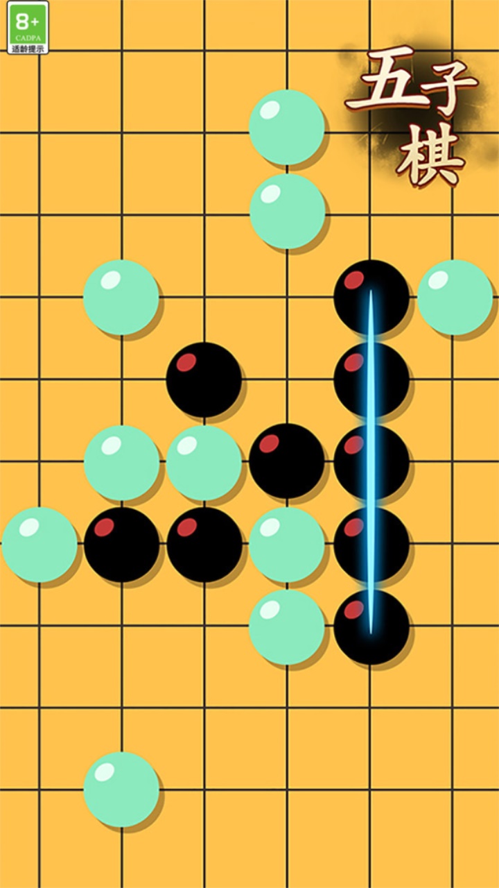 游戏通过点击屏幕横竖线交界点进行操作,点击放置棋子,五个连成一线的一方获得胜利;