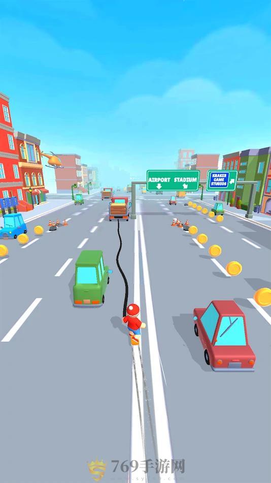 2.有趣有趣的跑酷闯关手游,操控着角色来释放一根锁钩来进行勾住一辆辆的汽车,让汽车来拖动着我们进行前进,一路上来避开一个个的障碍,并拾取一枚枚的金币。