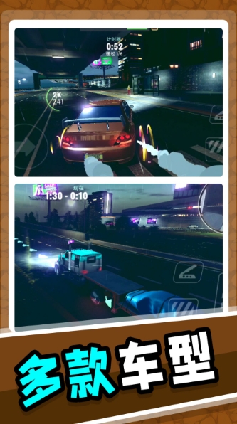 2、游戏内设有多种赛道环境,包括城市夜景、森林山脉、未来科幻世界等,玩家可以在不同的赛道中挑战极速;