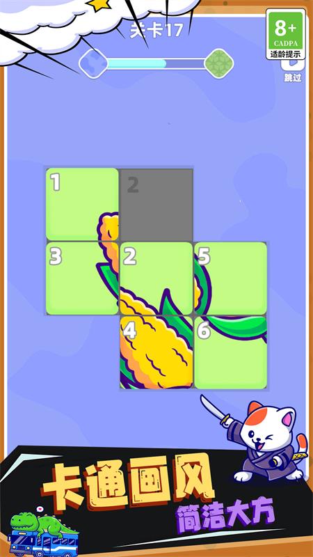 2、尽管游戏难度不高,但随着关卡的增加,拼图的数量逐渐增加,需要玩家灵活思维来解决日益复杂的挑战。