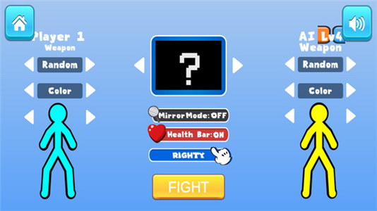 1、玩家可以在给出的五个一级火柴人中挑选一个,然后再在武器库中挑选一样武器。