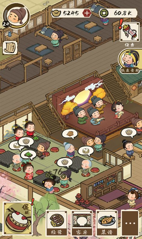 客官里面请游戏是一款Q版古风经营模拟游戏。经营一家酒家,招募店小二、打杂的、厨师、账房等人,通过完成任务来解锁全新的菜谱和获得家具,不断吸引更多的江湖武林人士前来用餐,Q版画风十分可爱,放置玩法也很轻松,喜欢的话就赶紧下载游戏吧。